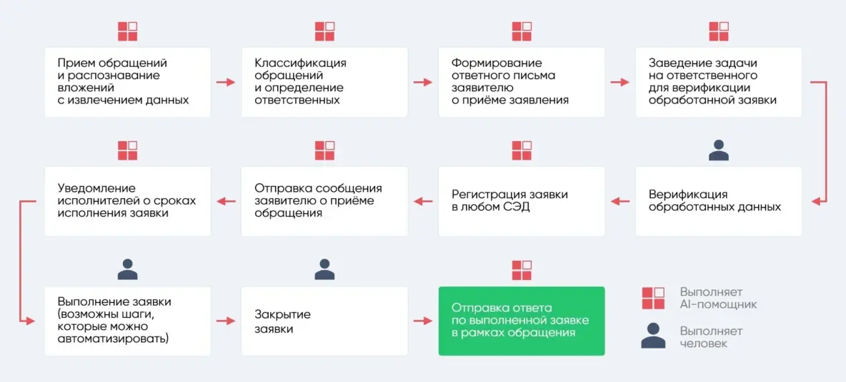 AI-помощник интегрируется с разными каналами приема обращений: это может быть электронная почта, сайт, мессенджер и т.д. Если заявитель позвонил, обращение также регистрируется и заносится в систему. В таком случае можно использовать голосового AI-помощника, который ведет диалог с гражданином, задает уточняющие вопросы и собирает всю необходимую информацию для дальнейшей фиксации в карточке обращения в СЭД.