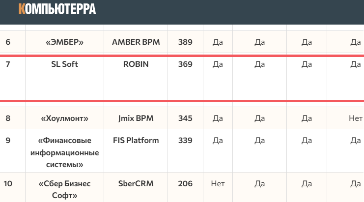 По версии независимого издания о технологиях «Компьютерра», платформа ROBIN компании SL Soft официально вошла в рейтинг лучших отечественных решений для low-code разработки за 2026 год, заняв позицию в ТОП-7.